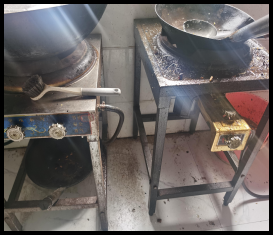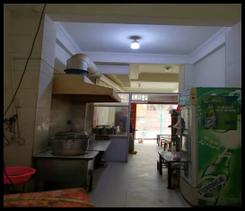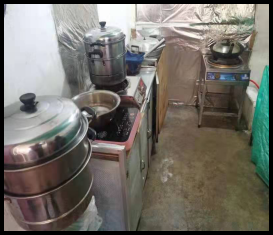 4、后廚環(huán)境差,物品擺放雜亂,灶臺(tái)、墻面油污重。