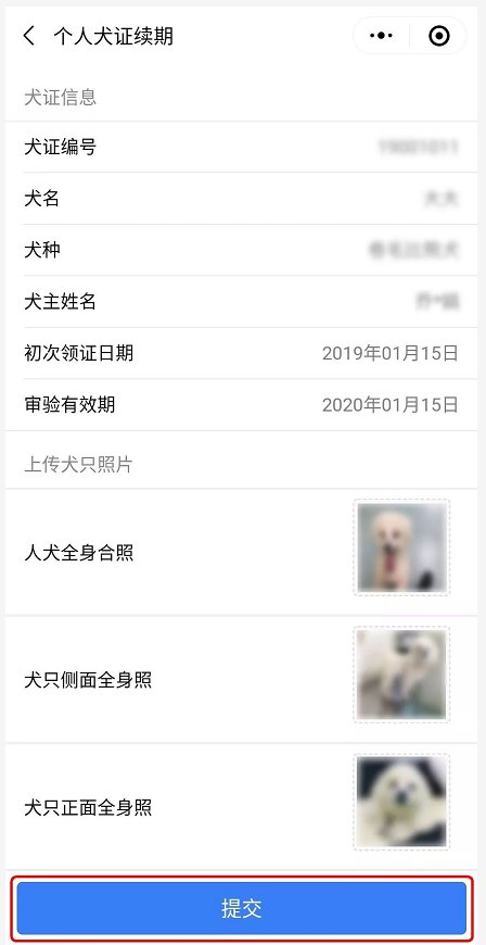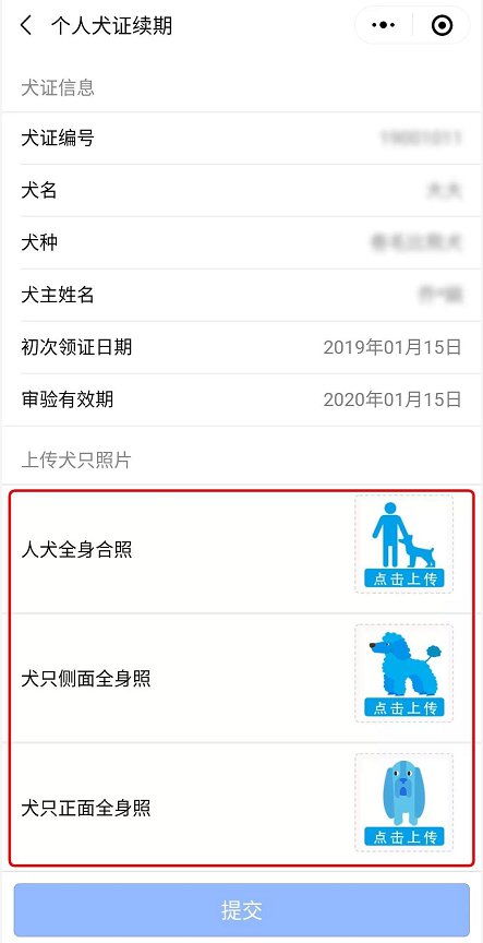 4、經(jīng)過一年,愛犬已經(jīng)長大啦,請(qǐng)?jiān)谏戏街匦律蟼鹘谀c愛犬的合照,以及近期愛犬的側(cè)面、正面全身照。好后,點(diǎn)擊下方“提交”按鈕。