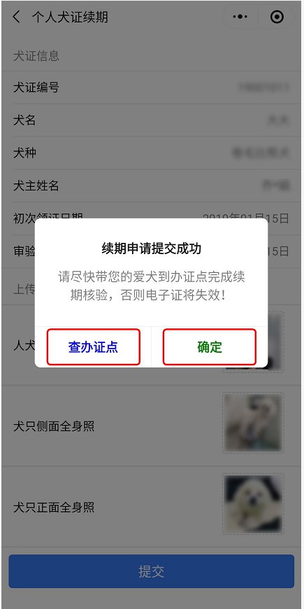5、提交成功,您可以點(diǎn)擊“確定”,帶上愛犬到原辦理點(diǎn)辦理續(xù)期審核,也可以點(diǎn)擊“查辦證點(diǎn)”選擇就近的辦理點(diǎn)辦理續(xù)期審核。