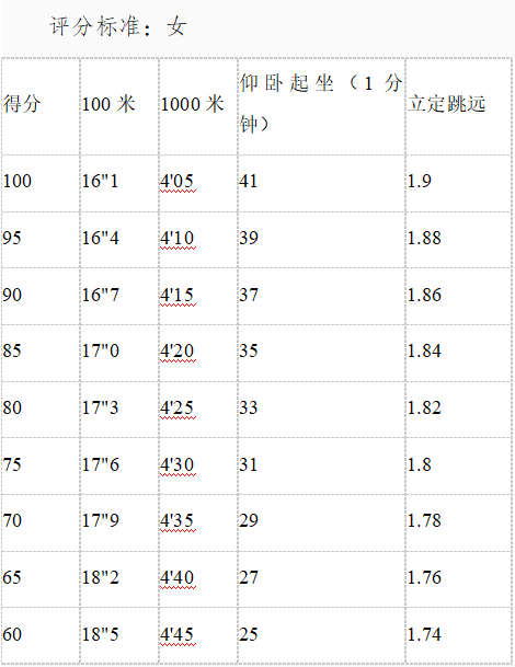 女:100米,1000米,仰臥起坐,立定跳遠