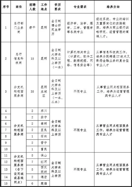 富滇銀行倡導和堅持“以人為本”的人才理念,積極為應屆畢業(yè)生提供有競爭力的薪酬、完善的福利、專業(yè)的培訓體系、廣闊職業(yè)晉升通道和發(fā)展平臺。根據(jù)業(yè)務發(fā)展需要,富滇銀行啟動2019年校園招聘,現(xiàn)將有關事項公告如下: