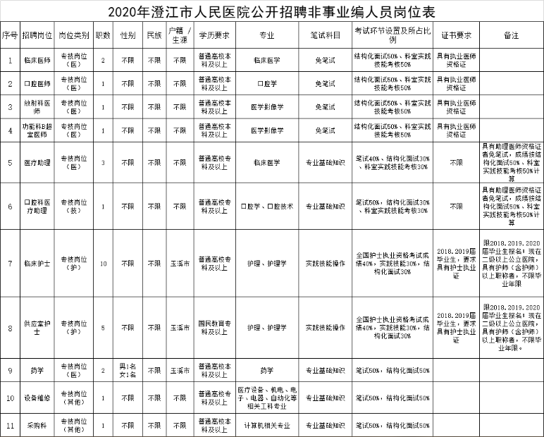 澄江市人民醫(yī)院2020年度面向社會(huì)公開招聘非事業(yè)編制工作人員38名,F(xiàn)將第一批招聘28名工作人員有關(guān)事宜公布如下: